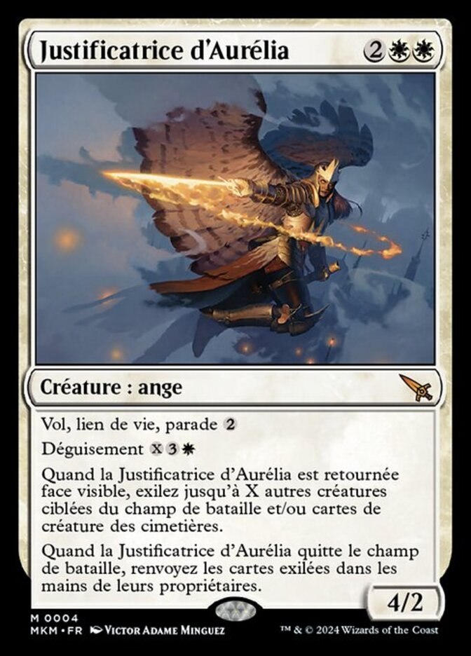 | Rules | Flying, lifelink, ward Disguise When Aurelia's Vindicator is turned face up, exile up to X other target creatures from the battlefield and/or creature cards from graveyards. When Aurelia's Vindicator leaves the battlefield, return the exiled cards to their owners' hands. |