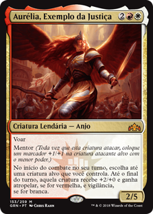 | Rules | Flying Mentor (Whenever this creature attacks, put a +1/+1 counter on target attacking creature with lesser power.) At the beginning of combat on your turn, choose up to one target creature you control. Until end of turn, that creature gets +2/+0, gains trample if it's red, and gains vigilance if it's white. |