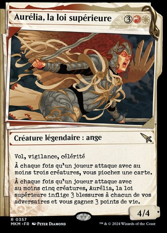 | Rules | Flying, vigilance, haste Whenever a player attacks with three or more creatures, you draw a card. Whenever a player attacks with five or more creatures, Aurelia, the Law Above deals 3 damage to each of your opponents and you gain 3 life. |