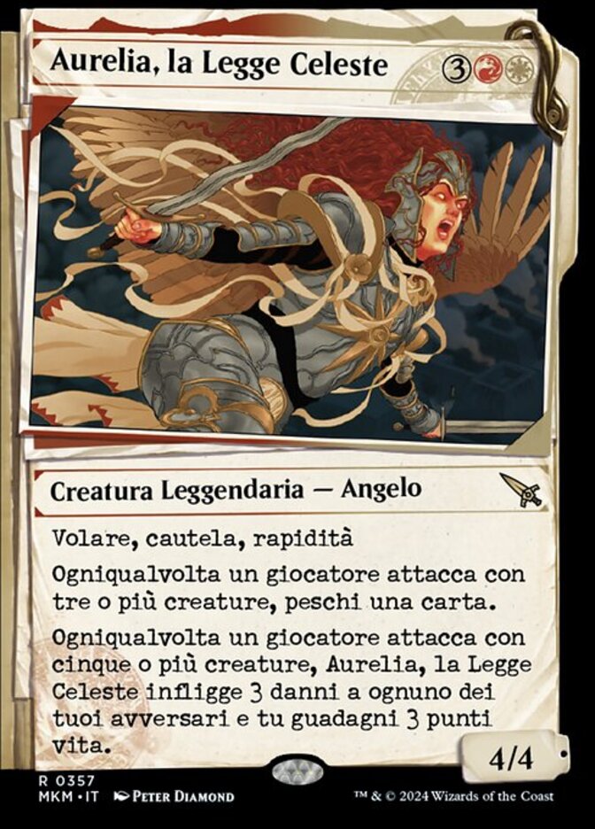 | Rules | Flying, vigilance, haste Whenever a player attacks with three or more creatures, you draw a card. Whenever a player attacks with five or more creatures, Aurelia, the Law Above deals 3 damage to each of your opponents and you gain 3 life. |