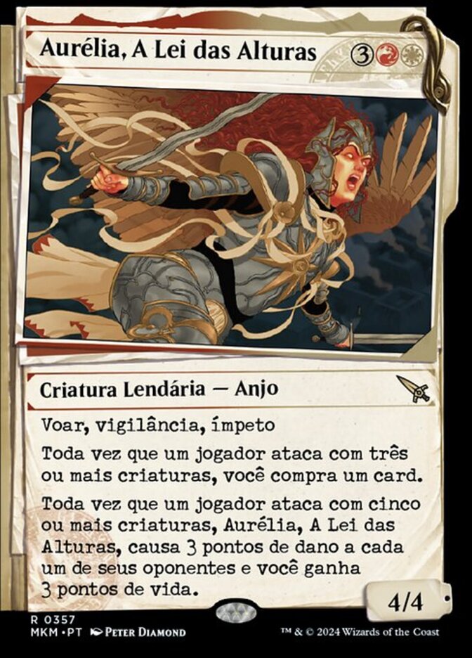 | Rules | Flying, vigilance, haste Whenever a player attacks with three or more creatures, you draw a card. Whenever a player attacks with five or more creatures, Aurelia, the Law Above deals 3 damage to each of your opponents and you gain 3 life. |