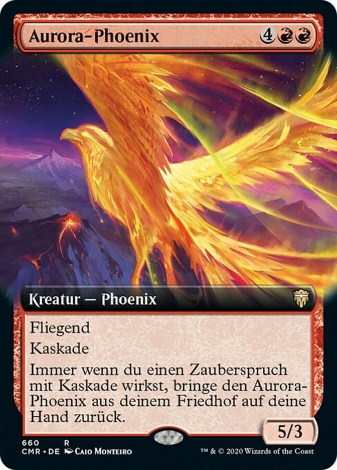 | Rules | Flying Cascade (When you cast this spell, exile cards from the top of your library until you exile a nonland card that costs less. You may cast it without paying its mana cost. Put the exiled cards on the bottom of your library in a random order.) Whenever you cast a spell with cascade, return Aurora Phoenix from your graveyard to your hand. |