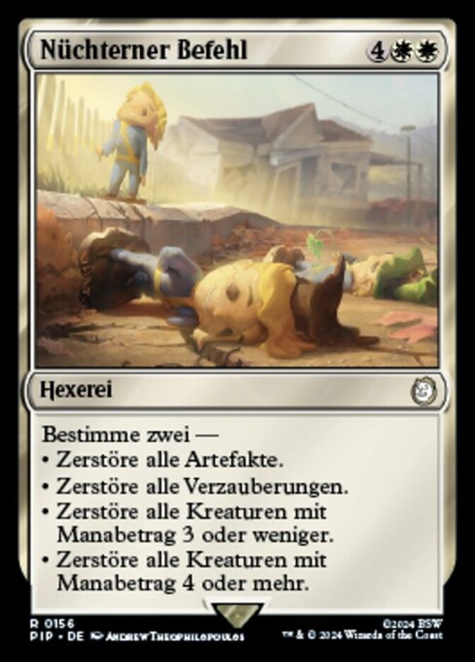 | Rules | Choose two — • Destroy all artifacts. • Destroy all enchantments. • Destroy all creatures with mana value 3 or less. • Destroy all creatures with mana value 4 or greater. |