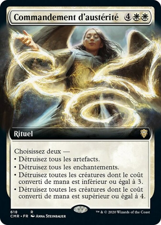 | Rules | Choose two — • Destroy all artifacts. • Destroy all enchantments. • Destroy all creatures with mana value 3 or less. • Destroy all creatures with mana value 4 or greater. |