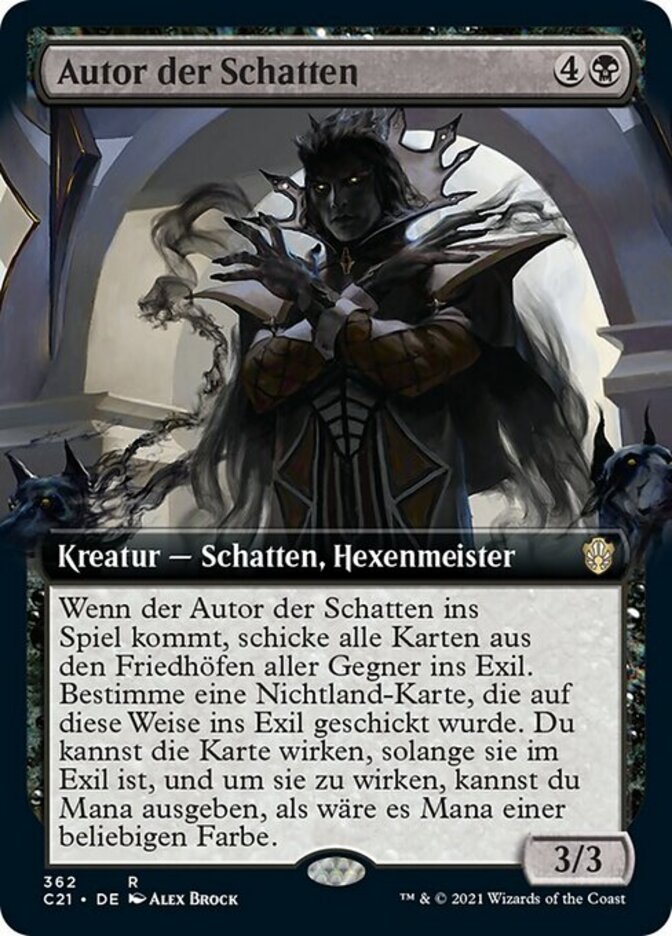 | Rules | When Author of Shadows enters the battlefield, exile all opponents' graveyards. Choose a nonland card exiled this way. You may cast that card for as long as it remains exiled, and you may spend mana as though it were mana of any color to cast that spell. |