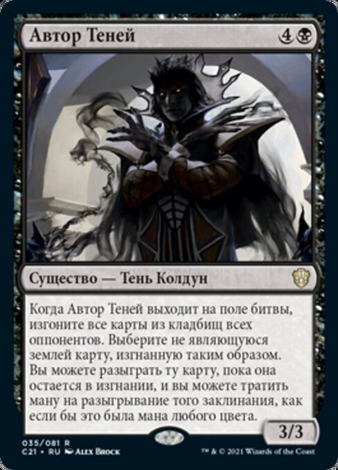 | Rules | When Author of Shadows enters the battlefield, exile all opponents' graveyards. Choose a nonland card exiled this way. You may cast that card for as long as it remains exiled, and you may spend mana as though it were mana of any color to cast that spell. |