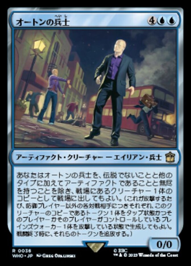 | Rules | You may have Auton Soldier enter the battlefield as a copy of any creature on the battlefield, except it isn't legendary, is an artifact in addition to its other types, and has myriad. (Whenever it attacks, for each opponent other than defending player, you may put a token that's a copy of this creature onto the battlefield tapped and attacking that player or a planeswalker they control. Exile the tokens at end of combat.) |