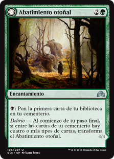 | Rules | : Mill a card. Delirium — At the beginning of your end step, if there are four or more card types among cards in your graveyard, transform Autumnal Gloom. // Trample, hexproof |