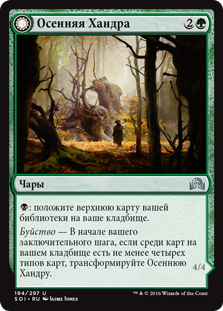 | Rules | : Mill a card. Delirium — At the beginning of your end step, if there are four or more card types among cards in your graveyard, transform Autumnal Gloom. // Trample, hexproof |