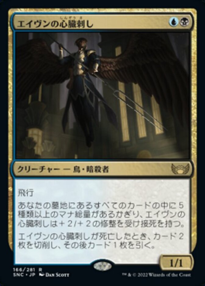 | Rules | Flying As long as there are five or more mana values among cards in your graveyard, Aven Heartstabber gets +2/+2 and has deathtouch. When Aven Heartstabber dies, mill two cards, then draw a card. |