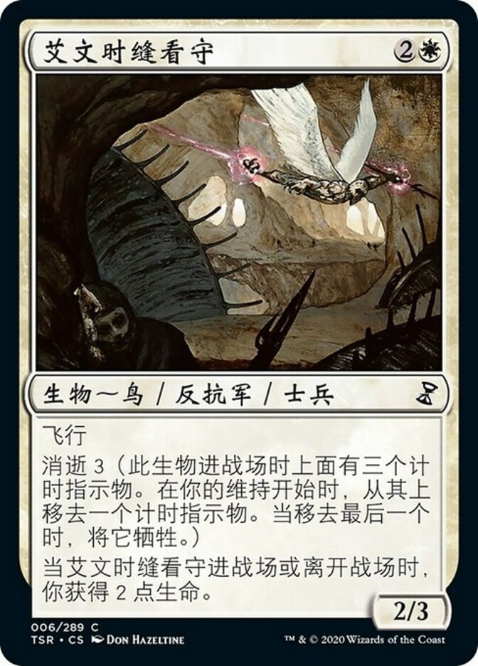 | Rules | Flying Vanishing 3 (This creature enters the battlefield with three time counters on it. At the beginning of your upkeep, remove a time counter from it. When the last is removed, sacrifice it.) When Aven Riftwatcher enters or leaves the battlefield, you gain 2 life. |