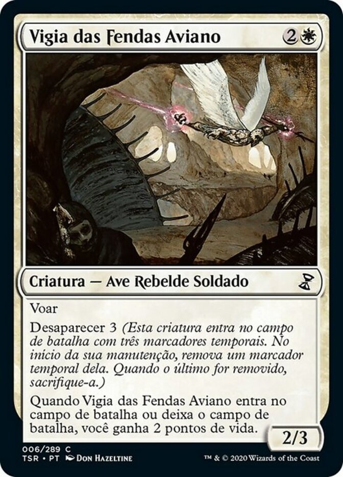 | Rules | Flying Vanishing 3 (This creature enters the battlefield with three time counters on it. At the beginning of your upkeep, remove a time counter from it. When the last is removed, sacrifice it.) When Aven Riftwatcher enters or leaves the battlefield, you gain 2 life. |