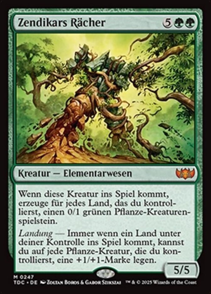 | Rules | When Avenger of Zendikar enters the battlefield, create a 0/1 green Plant creature token for each land you control. Landfall — Whenever a land enters the battlefield under your control, you may put a +1/+1 counter on each Plant creature you control. |