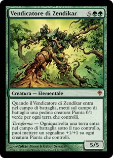 | Rules | When Avenger of Zendikar enters the battlefield, create a 0/1 green Plant creature token for each land you control. Landfall — Whenever a land enters the battlefield under your control, you may put a +1/+1 counter on each Plant creature you control. |