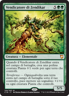| Rules | When Avenger of Zendikar enters the battlefield, create a 0/1 green Plant creature token for each land you control. Landfall — Whenever a land enters the battlefield under your control, you may put a +1/+1 counter on each Plant creature you control. |