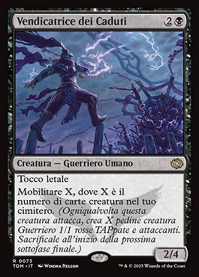 | Rules | Deathtouch Mobilize X, where X is the number of creature cards in your graveyard. (Whenever this creature attacks, create X tapped and attacking 1/1 red Warrior creature tokens. Sacrifice them at the beginning of the next end step.) |