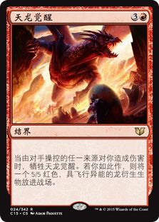 | Rules | When a source an opponent controls deals damage to you, sacrifice Awaken the Sky Tyrant. If you do, create a 5/5 red Dragon creature token with flying. |