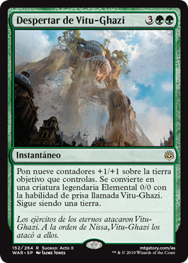 | Rules | Put nine +1/+1 counters on target land you control. It becomes a legendary 0/0 Elemental creature with haste named Vitu-Ghazi. It's still a land. |