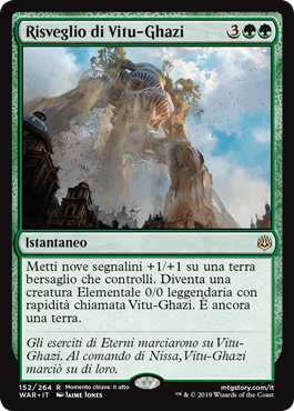 | Rules | Put nine +1/+1 counters on target land you control. It becomes a legendary 0/0 Elemental creature with haste named Vitu-Ghazi. It's still a land. |