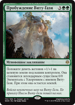 | Rules | Put nine +1/+1 counters on target land you control. It becomes a legendary 0/0 Elemental creature with haste named Vitu-Ghazi. It's still a land. |