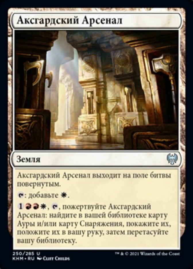 | Rules | Axgard Armory enters the battlefield tapped. : Add . , , Sacrifice Axgard Armory: Search your library for an Aura card and/or an Equipment card, reveal them, put them into your hand, then shuffle. |