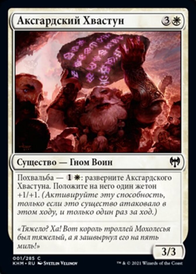 | Rules | Boast — : Untap Axgard Braggart. Put a +1/+1 counter on it. (Activate only if this creature attacked this turn and only once each turn.) |