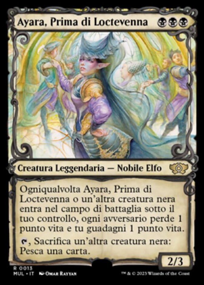 | Rules | Whenever Ayara, First of Locthwain or another black creature enters the battlefield under your control, each opponent loses 1 life and you gain 1 life. , Sacrifice another black creature: Draw a card. |