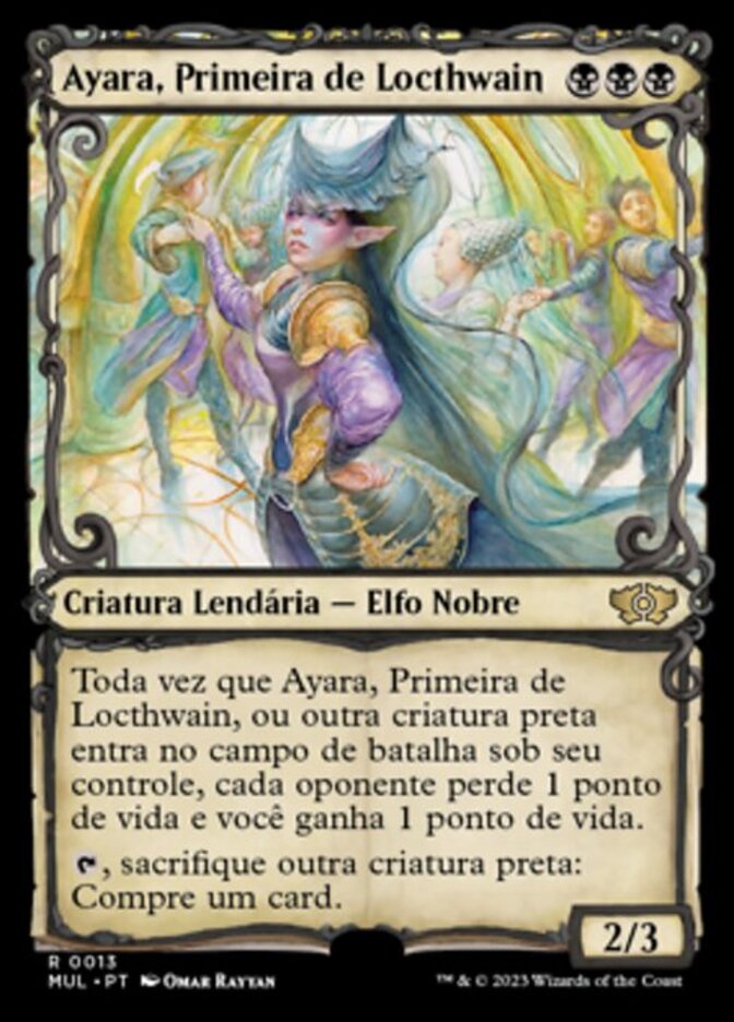 | Rules | Whenever Ayara, First of Locthwain or another black creature enters the battlefield under your control, each opponent loses 1 life and you gain 1 life. , Sacrifice another black creature: Draw a card. |