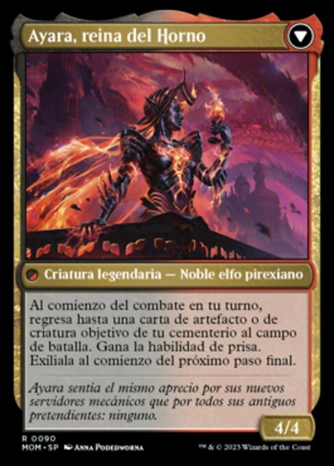 | Rules | , Sacrifice another creature or artifact: Ayara, Widow of the Realm deals X damage to target opponent or battle and you gain X life, where X is the sacrificed permanent's mana value. : Transform Ayara. Activate only as a sorcery. ( can be paid with either or 2 life.) // At the beginning of combat on your turn, return up to one target artifact or creature card from your graveyard to the battlefield. It gains haste. Exile it at the beginning of the next end step. |