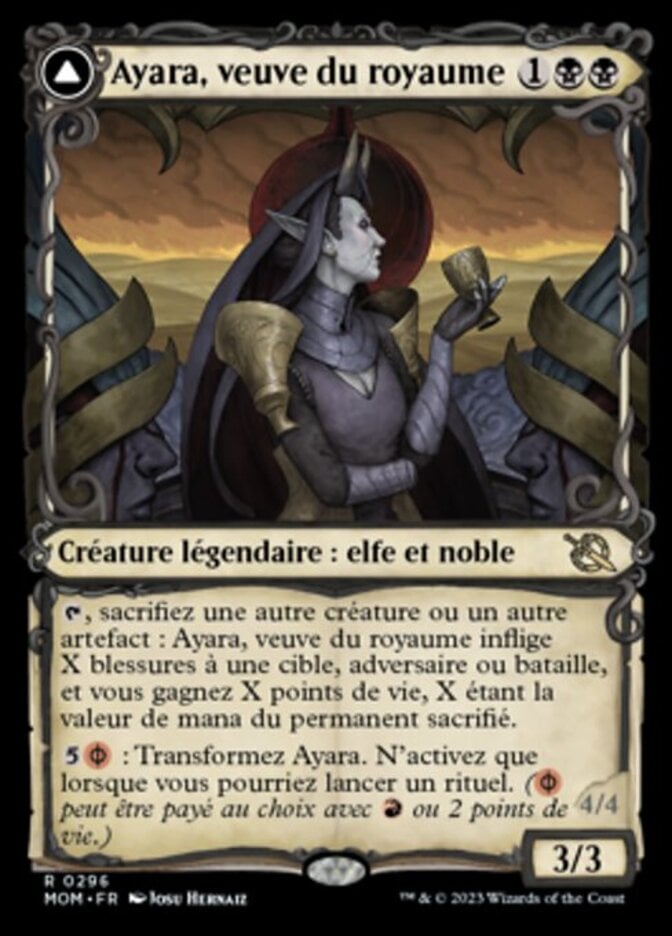 | Rules | , Sacrifice another creature or artifact: Ayara, Widow of the Realm deals X damage to target opponent or battle and you gain X life, where X is the sacrificed permanent's mana value. : Transform Ayara. Activate only as a sorcery. ( can be paid with either or 2 life.) // At the beginning of combat on your turn, return up to one target artifact or creature card from your graveyard to the battlefield. It gains haste. Exile it at the beginning of the next end step. |