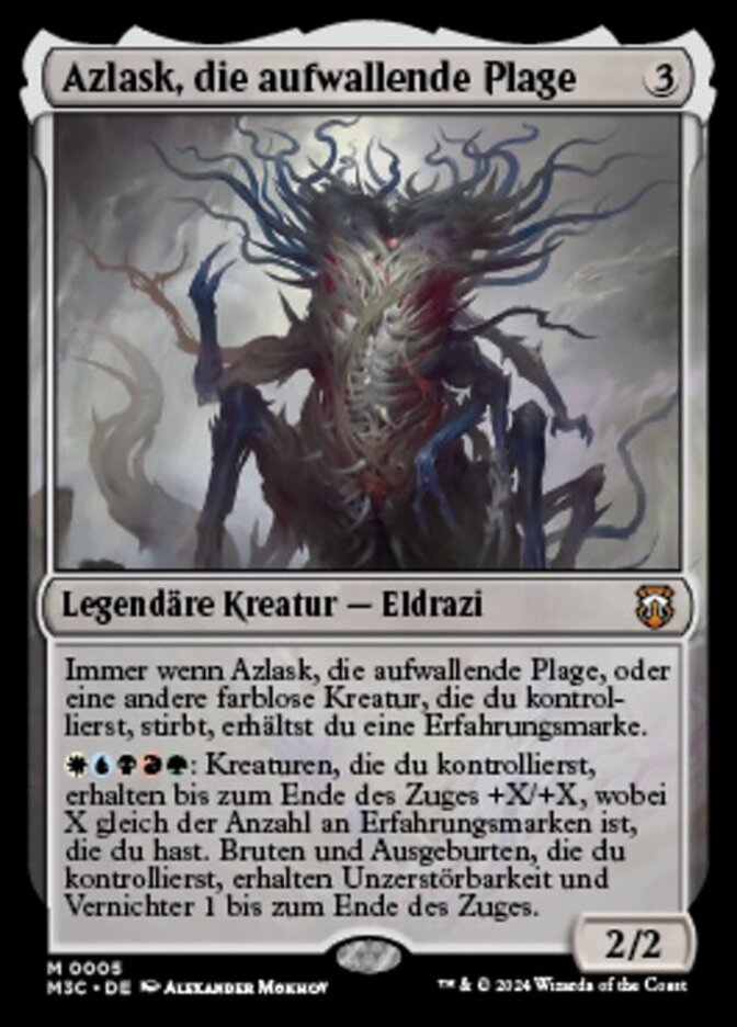 | Rules | Whenever Azlask, the Swelling Scourge or another colorless creature you control dies, you get an experience counter. : Creatures you control get +X/+X until end of turn, where X is the number of experience counters you have. Scions and Spawns you control gain indestructible and annihilator 1 until end of turn. |
