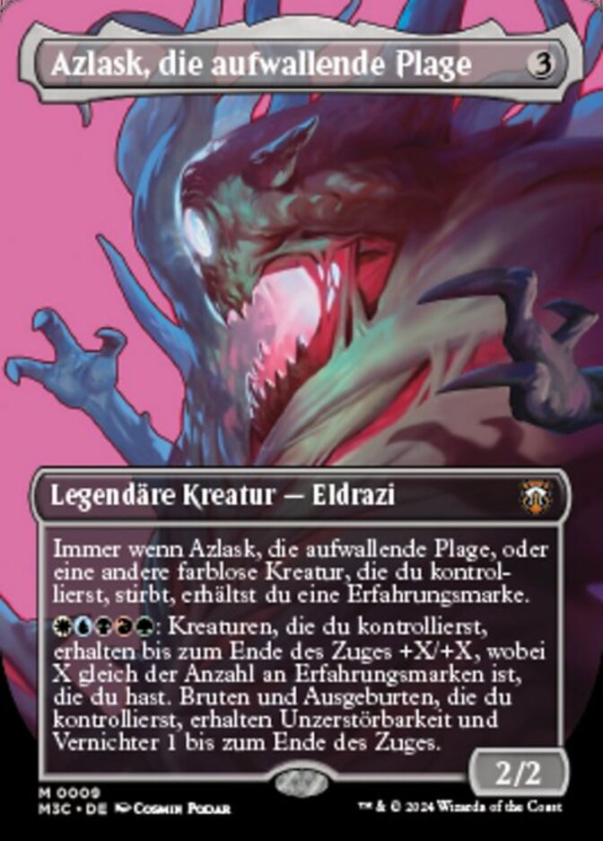 | Rules | Whenever Azlask, the Swelling Scourge or another colorless creature you control dies, you get an experience counter. : Creatures you control get +X/+X until end of turn, where X is the number of experience counters you have. Scions and Spawns you control gain indestructible and annihilator 1 until end of turn. |