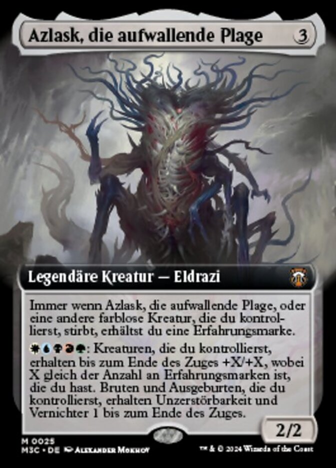 | Rules | Whenever Azlask, the Swelling Scourge or another colorless creature you control dies, you get an experience counter. : Creatures you control get +X/+X until end of turn, where X is the number of experience counters you have. Scions and Spawns you control gain indestructible and annihilator 1 until end of turn. |