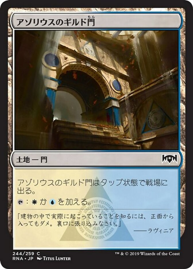 Languages Azorius Guildgate Portão da Guilda Azorius 俄佐立公会门 Azorius-Gildeneingang アゾリウスのギルド門 俄佐立公會門 Porte de la guilde d'Azorius 아조리우스 길드관문 Portal del Gremio Azorio Cancello della Gilda Azorius Врата Гильдии Азориусов