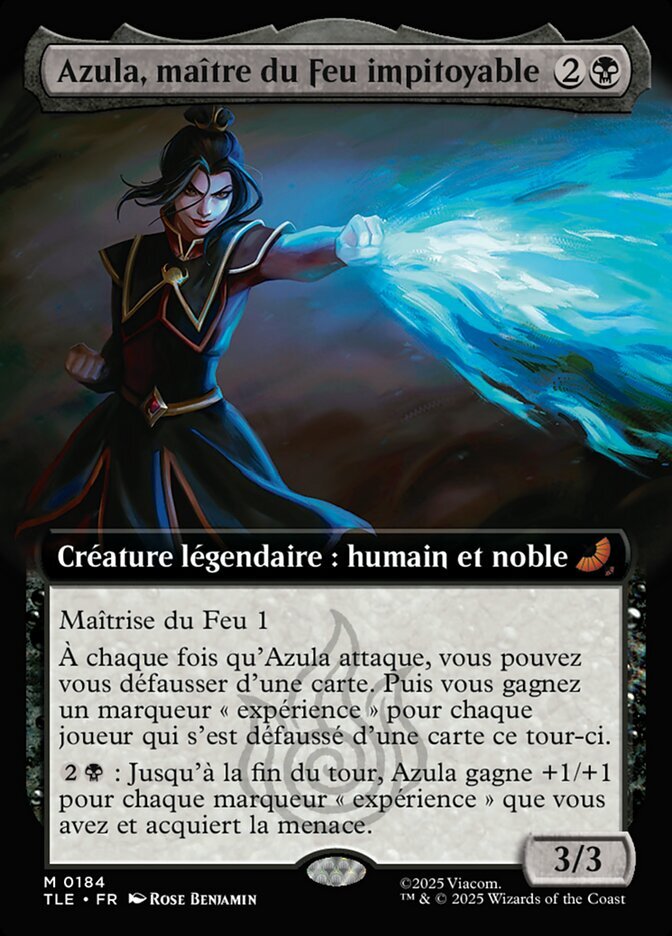 | Rules | Firebending 1 (Whenever this creature attacks, add . This mana lasts until end of combat.) Whenever Azula attacks, you may discard a card. Then you get an experience counter for each player who discarded a card this turn. : Until end of turn, Azula gets +1/+1 for each experience counter you have and gains menace. |