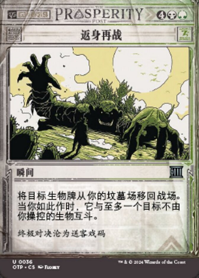 | Rules | Return target creature card from your graveyard to the battlefield. When you do, it fights up to one target creature you don't control. (Each deals damage equal to its power to the other.) |