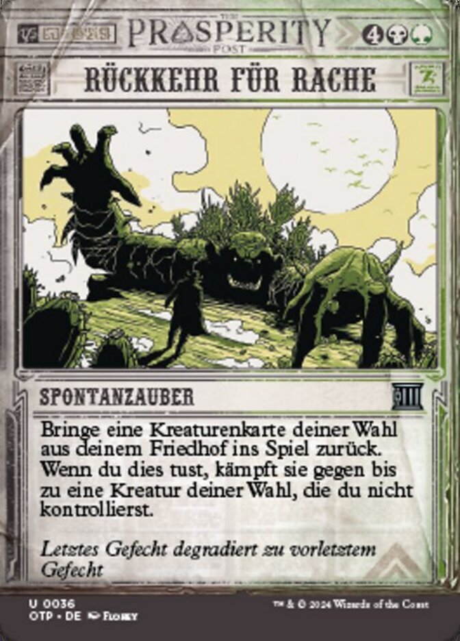 | Rules | Return target creature card from your graveyard to the battlefield. When you do, it fights up to one target creature you don't control. (Each deals damage equal to its power to the other.) |