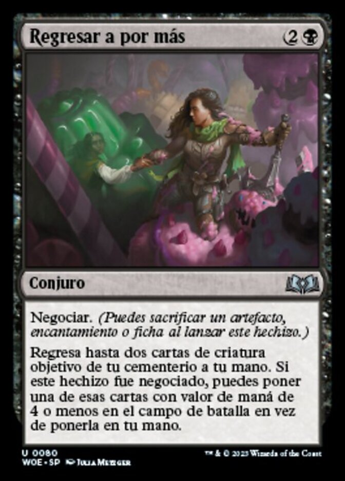 | Rules | Bargain (You may sacrifice an artifact, enchantment, or token as you cast this spell.) Return up to two target creature cards from your graveyard to your hand. If this spell was bargained, you may put one of those cards with mana value 4 or less onto the battlefield instead of putting it into your hand. |