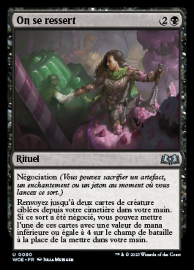 | Rules | Bargain (You may sacrifice an artifact, enchantment, or token as you cast this spell.) Return up to two target creature cards from your graveyard to your hand. If this spell was bargained, you may put one of those cards with mana value 4 or less onto the battlefield instead of putting it into your hand. |