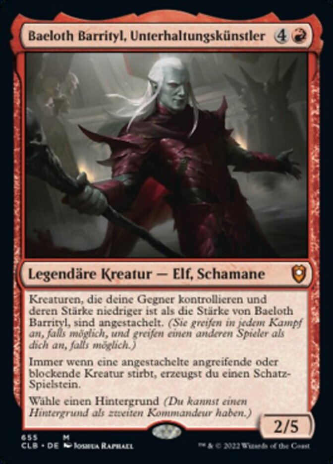 | Rules | Creatures your opponents control with power less than Baeloth Barrityl's power are goaded. (They attack each combat if able and attack a player other than you if able.) Whenever a goaded attacking or blocking creature dies, you create a Treasure token. Choose a Background (You can have a Background as a second commander.) |
