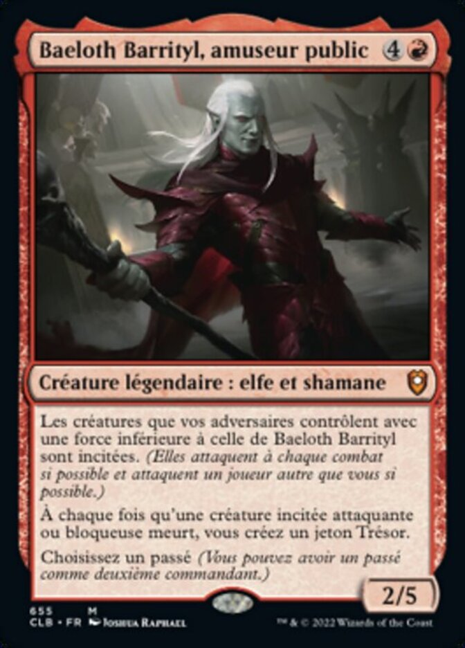 | Rules | Creatures your opponents control with power less than Baeloth Barrityl's power are goaded. (They attack each combat if able and attack a player other than you if able.) Whenever a goaded attacking or blocking creature dies, you create a Treasure token. Choose a Background (You can have a Background as a second commander.) |