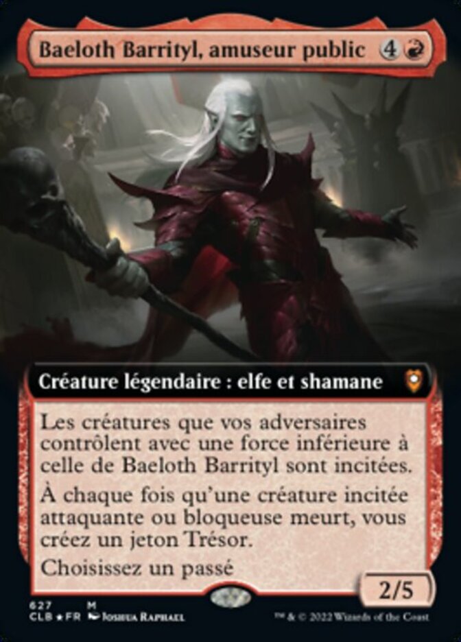 | Rules | Creatures your opponents control with power less than Baeloth Barrityl's power are goaded. (They attack each combat if able and attack a player other than you if able.) Whenever a goaded attacking or blocking creature dies, you create a Treasure token. Choose a Background (You can have a Background as a second commander.) |