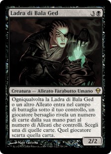 | Rules | Whenever Bala Ged Thief or another Ally enters the battlefield under your control, target player reveals a number of cards from their hand equal to the number of Allies you control. You choose one of them. That player discards that card. |