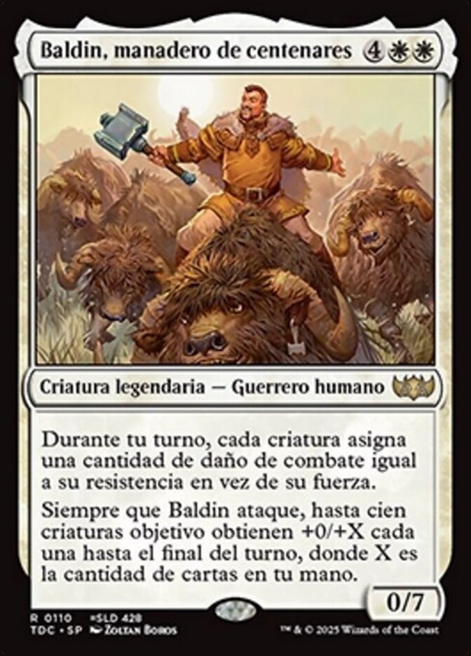 | Rules | As long as it's your turn, each creature assigns combat damage equal to its toughness rather than its power. Whenever Baldin, Century Herdmaster attacks, up to one hundred target creatures each get +0/+X until end of turn, where X is the number of cards in your hand. |