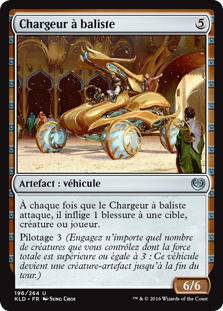 | Rules | Whenever Ballista Charger attacks, it deals 1 damage to any target. Crew 3 (Tap any number of creatures you control with total power 3 or more: This Vehicle becomes an artifact creature until end of turn.) |