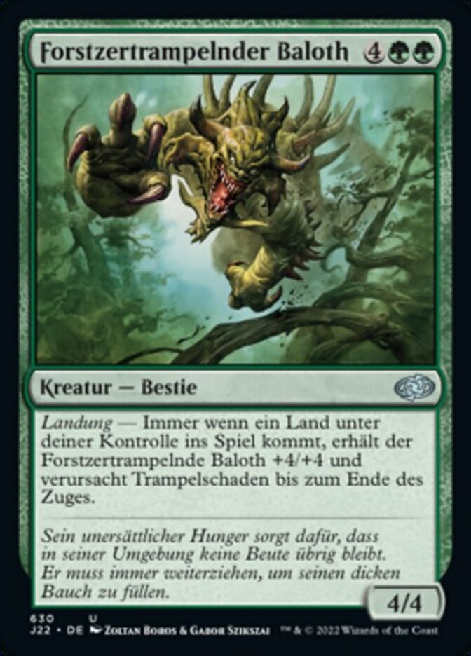 | Rules | Landfall — Whenever a land enters the battlefield under your control, Baloth Woodcrasher gets +4/+4 and gains trample until end of turn. |
