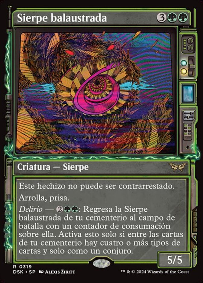 | Rules | This spell can't be countered. Trample, haste Delirium — : Return Balustrade Wurm from your graveyard to the battlefield with a finality counter on it. Activate only if there are four or more card types among cards in your graveyard and only as a sorcery. |