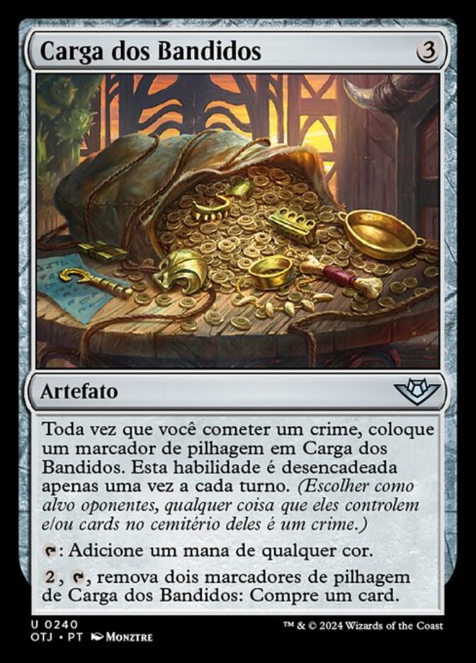 | Rules | Whenever you commit a crime, put a loot counter on Bandit's Haul. This ability triggers only once each turn. (Targeting opponents, anything they control, and/or cards in their graveyards is a crime.) : Add one mana of any color. , , Remove two loot counters from Bandit's Haul: Draw a card. |