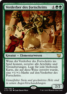 | Rules | When Bane of Progress enters the battlefield, destroy all artifacts and enchantments. Put a +1/+1 counter on Bane of Progress for each permanent destroyed this way. |