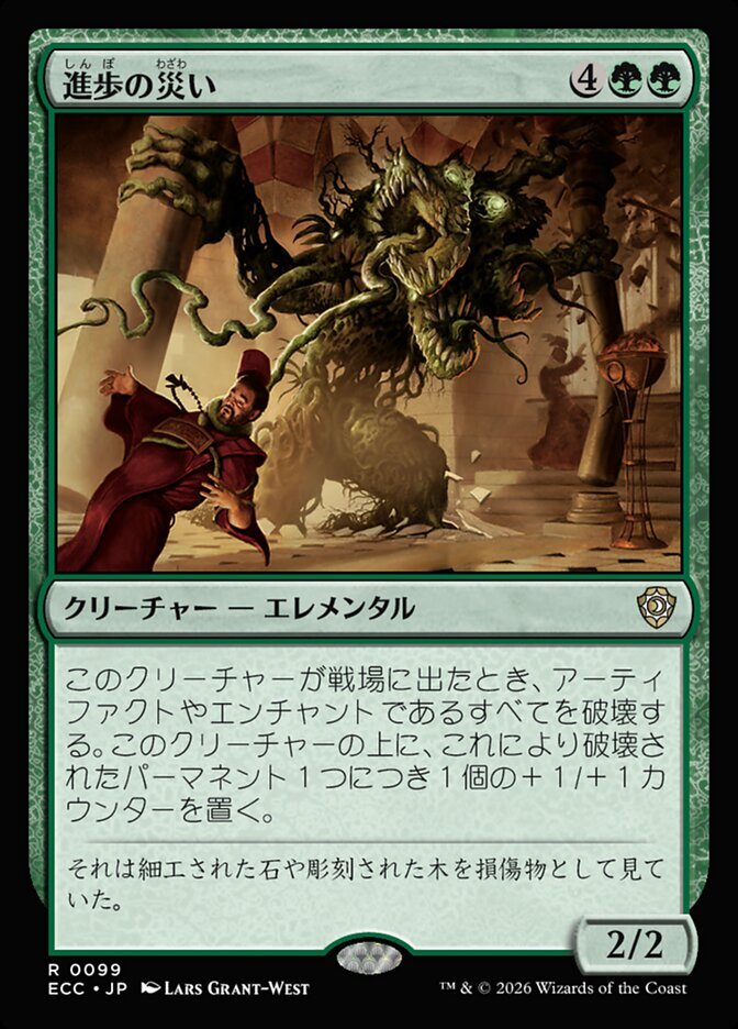 | Rules | When Bane of Progress enters the battlefield, destroy all artifacts and enchantments. Put a +1/+1 counter on Bane of Progress for each permanent destroyed this way. |